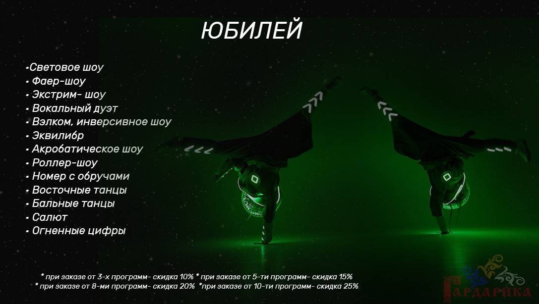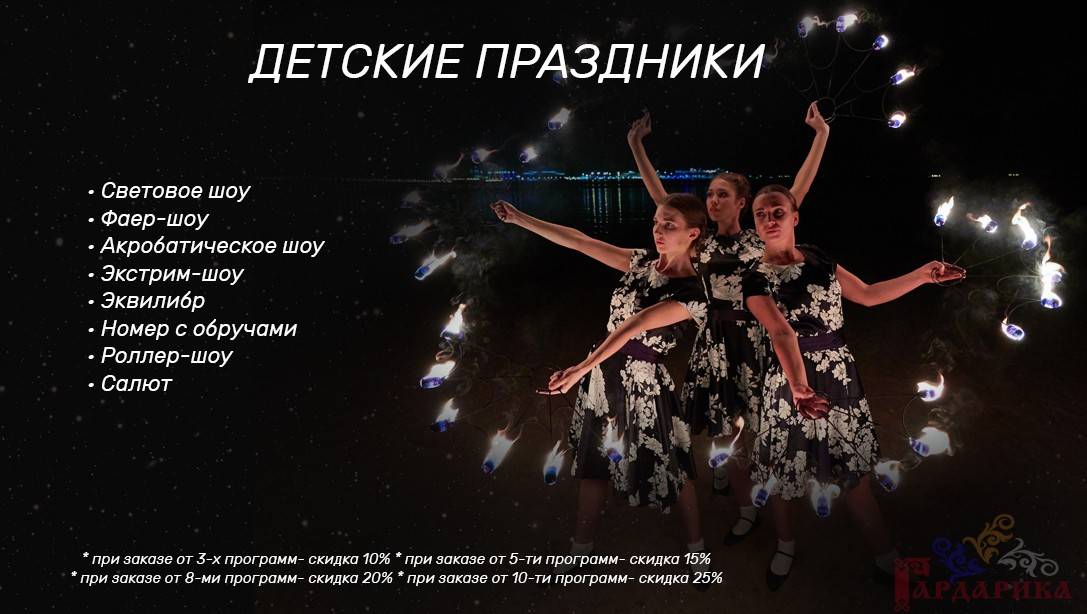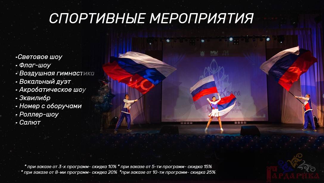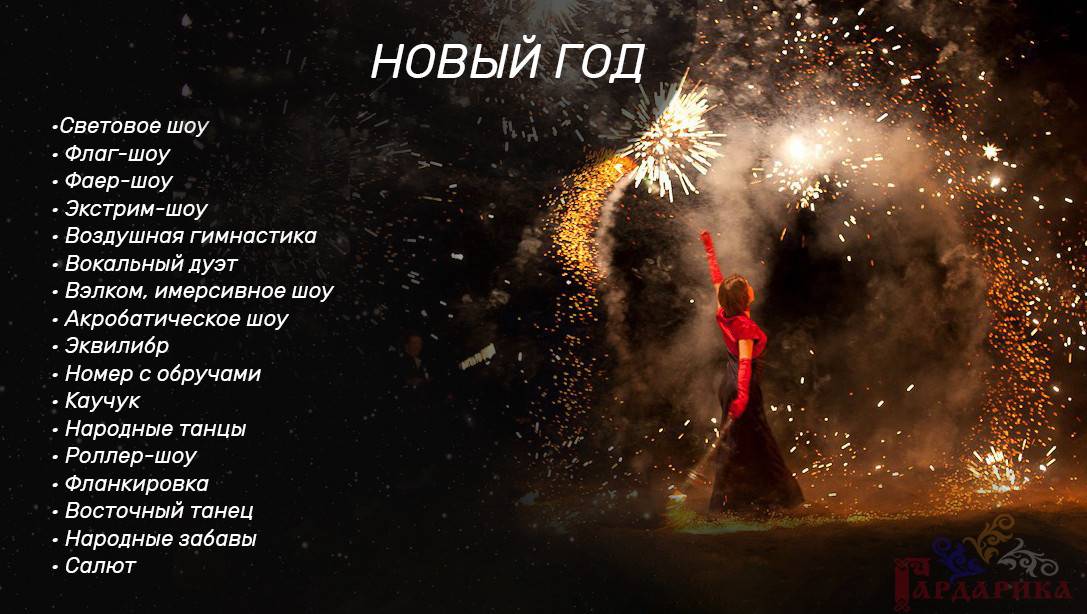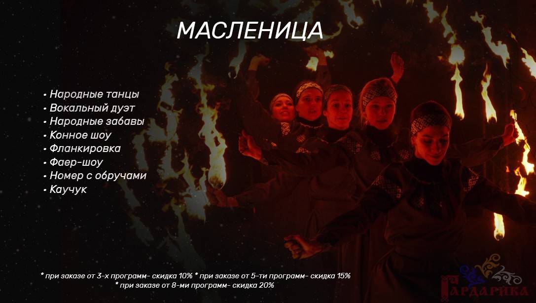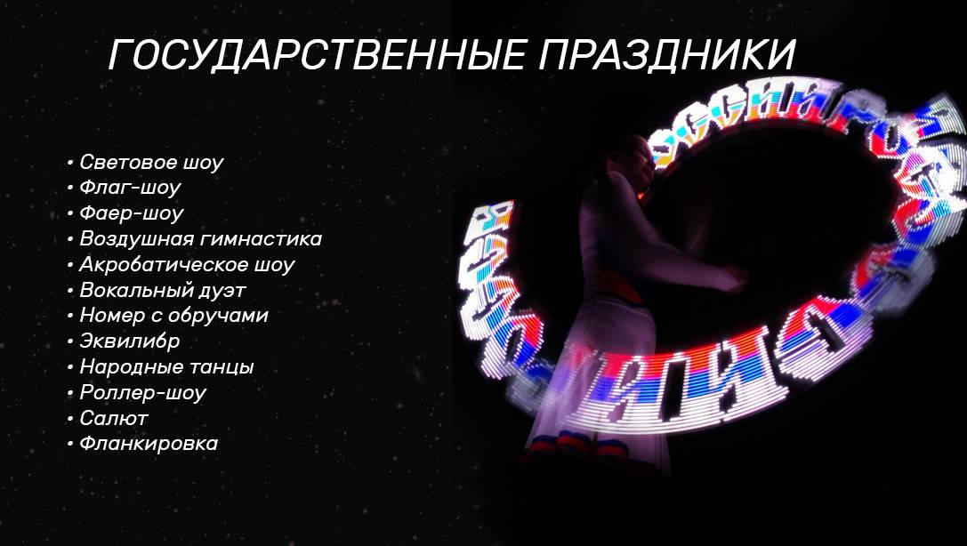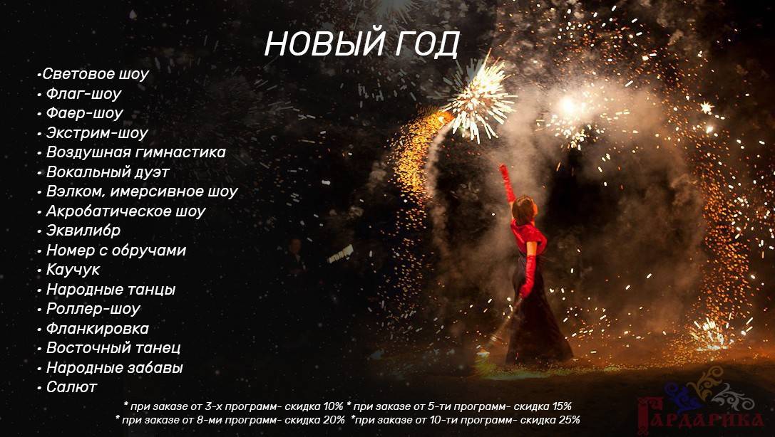 Мы подготовили для Вас различные наборы шоу, которые лучше всего подходят для свадьбы, спортивных мероприятий, масленицы, государственных праздников, корпоративов, детских праздников, юбилея, нового года. Вы можете выбрать самые подходящие для Вас направления.